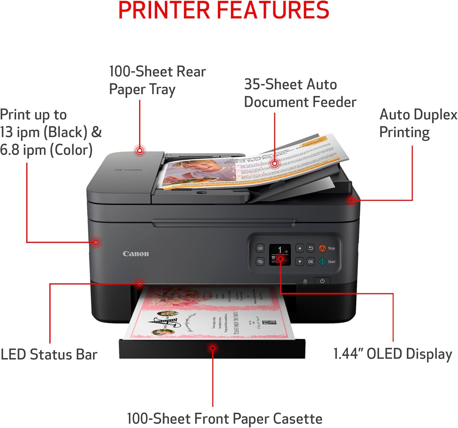 About this item Sold as 1 Each. All-in-one convenience from Canon print, copy, and scan effortlessly with the Canon PIXMA TR7020a Wireless Color All-in-One Inkjet Printer.. Stay connected with versatile USB and Wi-Fi printing options, suitable for both home and office environments.. Intuitive 1.44″ display for simple setup and navigation through all your printing needs.. Flexible paper feeding options with front and rear trays, allowing for simultaneous plain paper loading and easy media switching.. Compatible with the Canon PIXMA Print Plan Ink Subscription Service – Flexible plans available where ink is delivered hassle-free right to your door automatically when you run low! *. Compact design with dimensions of 8.2″H x 14.4″W x 15.9″D enhances productivity without taking up too much space. Superior scanning quality with 1200 x 2400 dpi optical resolution, and 8-bit color depth, ideal for capturing detailed text and images. High-quality, vibrant prints with impressive 4800 DPI resolution, perfect for professional documents and photos.. Versatile media support, handle everything from glossy photo paper to cards, envelopes, and even magnetic photo paper.. Energy-efficient and environmentally friendly, the Canon PIXMA TR7020a meets ENERGY STAR standards.. Backed by a 1-year manufacturer limited warranty for peace of mind and protection for your investment.. Enjoy efficient printing with color print speed up to 6.8 IPM and black white up to 13 IPM, alongside automatic double-sided printing for letter-sized documents.. Save paper and time with automatic double-sided printing, creating streamlined two-sided documents with ease.. Stylish and adaptable, this black printer blends seamlessly with your home or office workspace.. * Failure to connect your PIXMA Printer to the Internet will impact Canon’s ability to ship PIXMA Print Plan Cartridge(s) on a