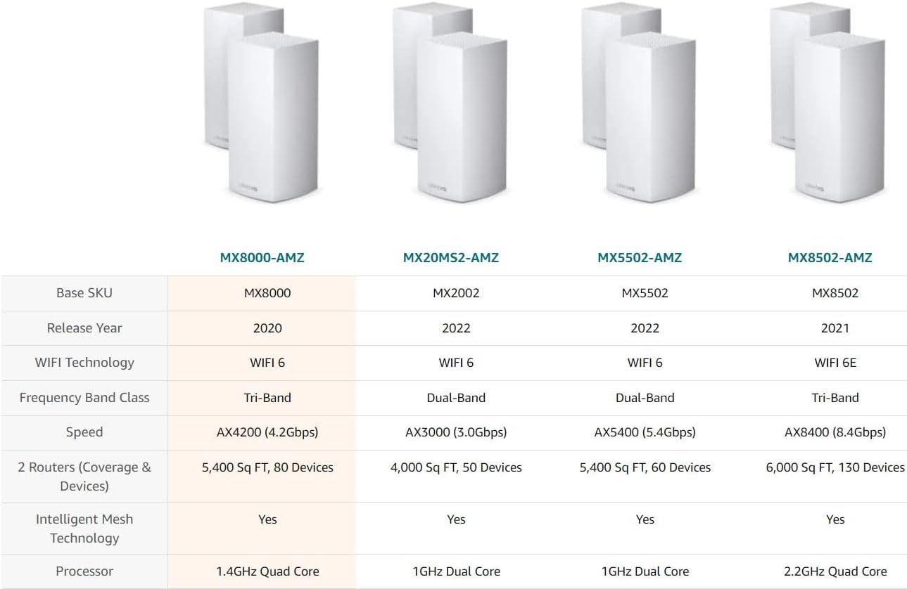 About this item LIGHTNING FAST WIFI SPEEDS: Mesh WiFi 6 Routers are designed to deliver gigabit WiFi speeds to your entire home, backyard and outdoor smart home devices POWERFUL MESH WIFI 6 COVERAGE: Supporting 80+ devices, covering up to 5,400 sq ft these mesh WiFi routers provide up to 3.5x more WiFi capacity for more stable streaming, gaming, and smart home devices EASY SETUP & CONTROL: Wireless routers set up in minutes with the free Linksys App, allowing seamless management of your mesh network system from home or on the go SECURITY OUT OF THE BOX – With automatic firmware updates, parental controls, and separate guest networks these WiFi mesh routers allow the entire family to surf safely POWERED BY INTELLIGENT MESH TECHNOLOGY: Eliminate dead zones and dynamically maximize speed with Linksys WiFi mesh networks. Expand the range of your WiFi network by adding nodes to keep your connection going strong